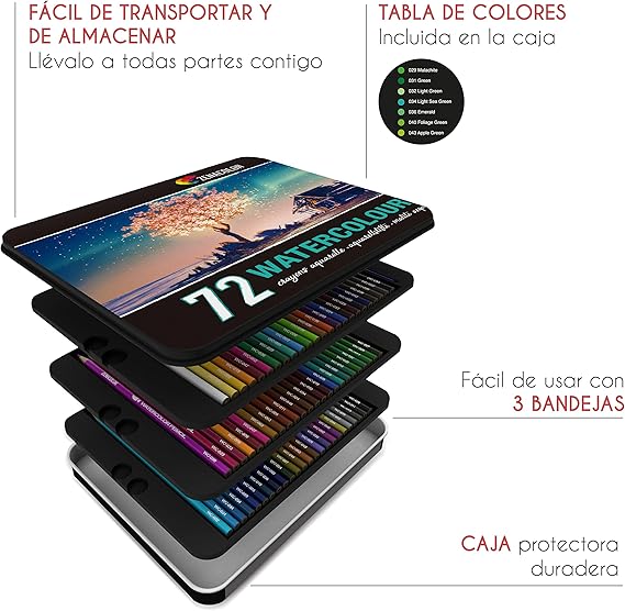This set of 72 watercolor pencils contains different and unique water-soluble coloring pencils. They come with a brush so you can create stuffing effects and mixes of color. They come pre-sharpened they dissolve in water and have 3.3 mm soft but sturdy leads for intense coloring.